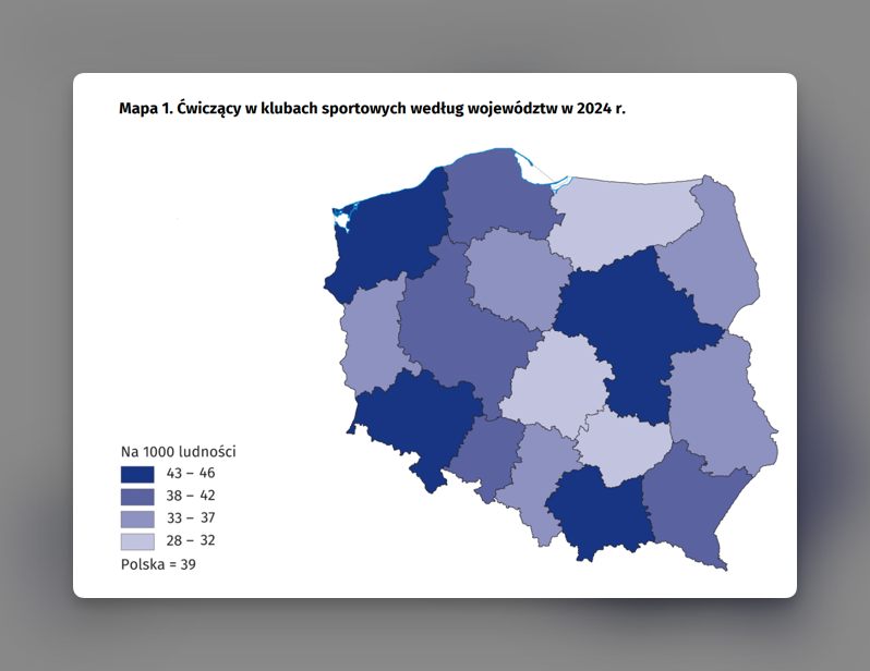 Aktywność sportowa nie jest rozłożona równomiernie. Analiza geograficzna pokazuje wyraźnych liderów. Najwięcej klubów sportowych działa w województwie mazowieckim (11,3% wszystkich klubów), a tuż za nim plasują się województwa: