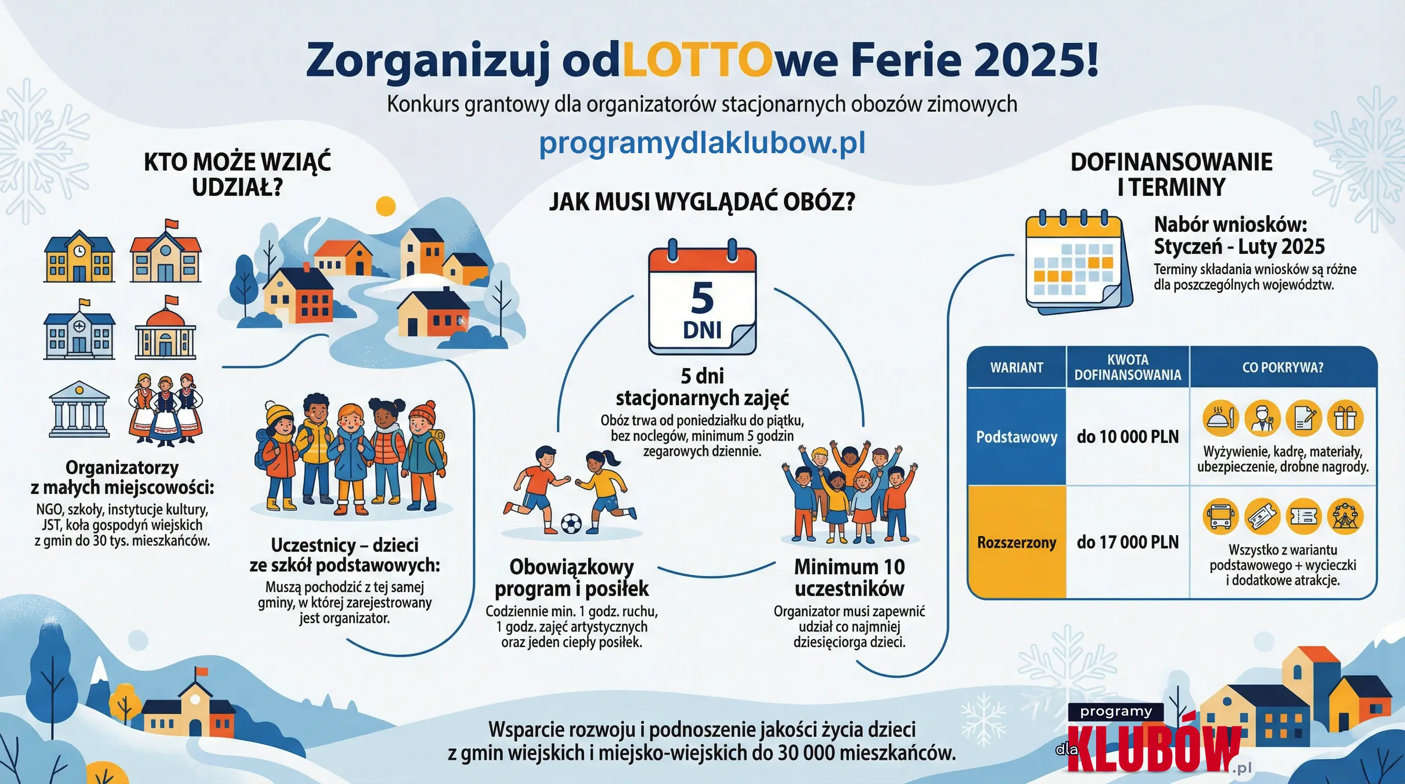 Program "odLOTTOwe ferie z Fundacją LOTTO" to wyjątkowa szansa dla organizacji z miejscowości do 30 000 mieszkańców na pozyskanie środków na organizację zimowego wypoczynku dla dzieci i młodzieży. Finansowany przez Fundację LOTTO im. Haliny Konopackiej, program umożliwia uzyskanie do 17 000 zł na realizację obozu stacjonarnego (półkolonii).