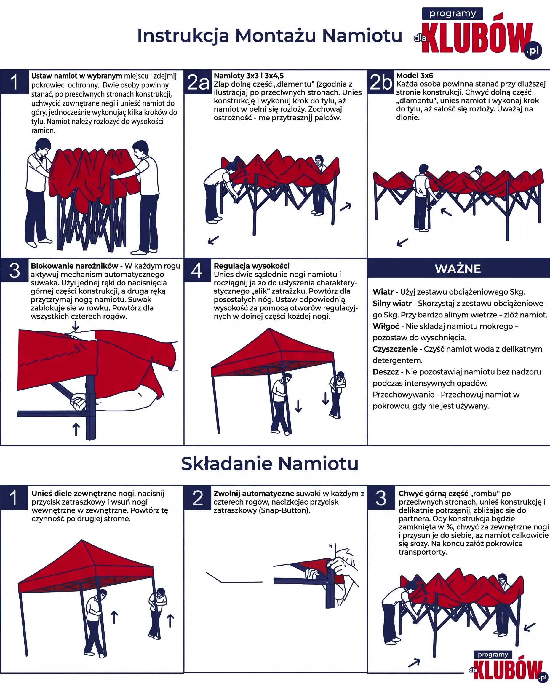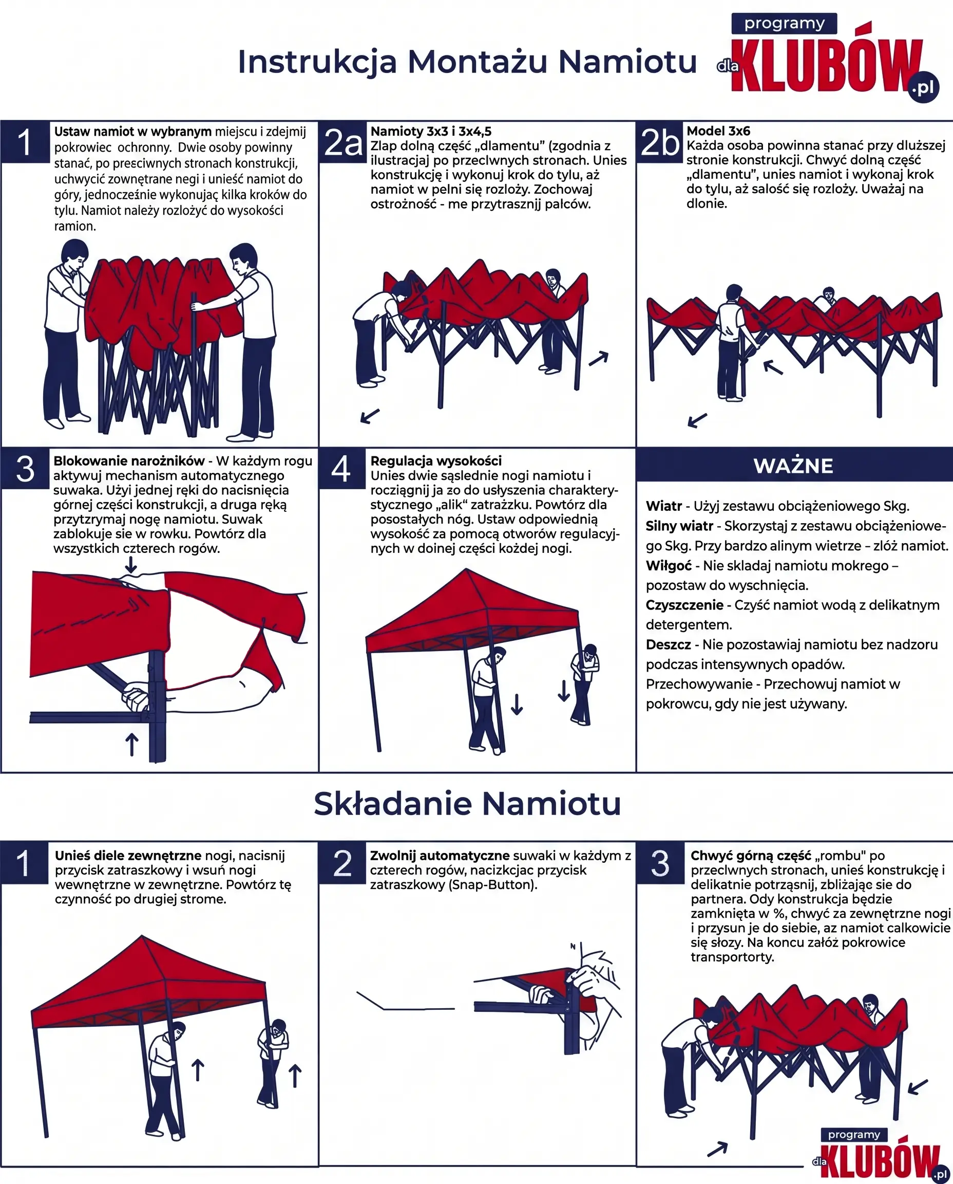 Ustaw namiot w wybranym miejscu i zdejmij pokrowiec ochronny. Dwie osoby powinny stanąć po przeciwnych stronach konstrukcji, uchwycić zewnętrzne nogi i unieść namiot do góry, jednocześnie wykonując kilka kroków do tyłu. Namiot należy rozłożyć do wysokości ramion.